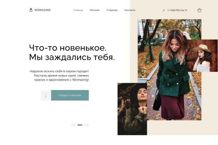 Интернет магазин одежды. Дизайн вызывает интерес женщин сочетанием теплых цветов, при котором внимание удерживается с помощью хорошо подобраных моделей и простотой текста.