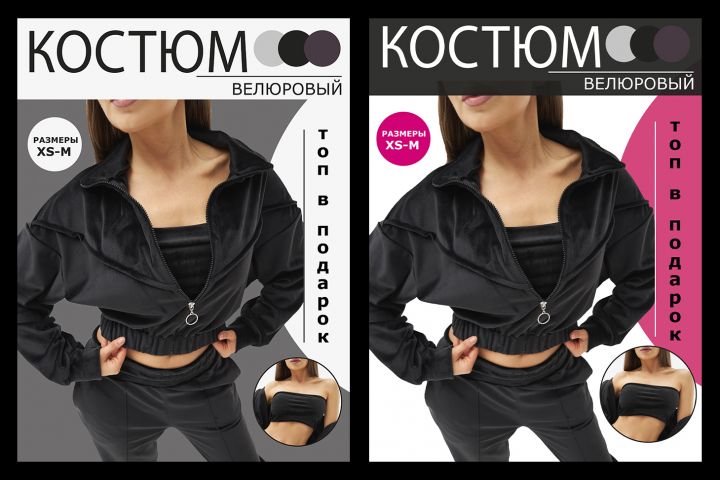 Инфографика для маркетплейса ВБ. Категория одежда (велюровый костюм). Два варианта офрмления карточки