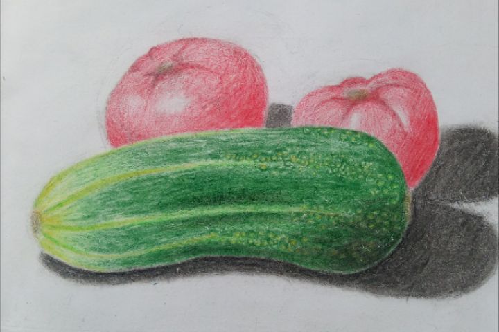 Натюрморт, рисунок с реальных предметов: огурец и два помидора. Материалы: карандаши, альбомный лист.