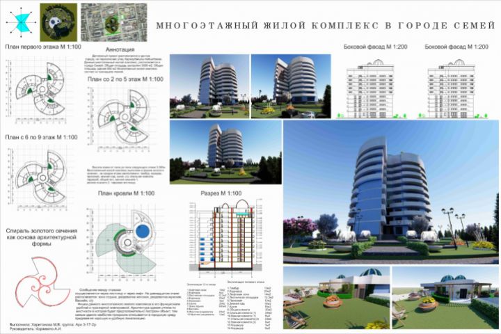 Жилой комплекс — это один или (чаще) несколько многоквартирных жилых домов, объединённых единой, специально спланированной территорией, конкретно в этом случае идеей было объединить все в одном здание. Он включает в себя жилой комплекс, оздоровительный, спортивный и тд. Образ каждой квартиры в 180 градусов. Проект выполнен на основе золотого сечения, золотое сечение - гармоническая пропорция, в которой одна часть относится к другой, как всё целое к первой части.