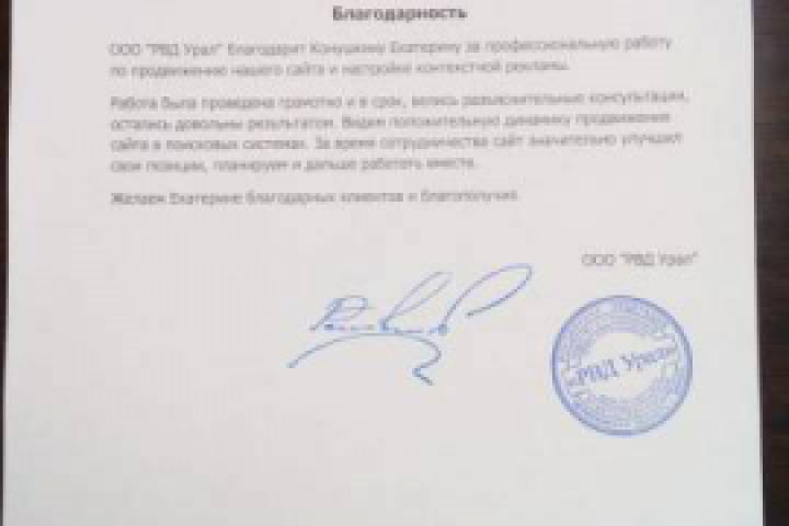 Отзыв о моей работе от Интернет магазина РВД Урал