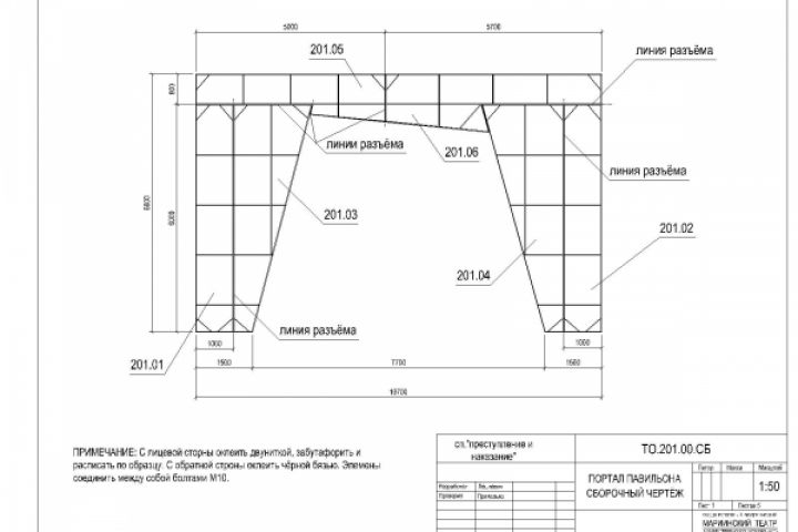 Конструктивный чертёж элемента декорационного оформления спектакля, (с указанием габаритных размеров, а так же с указанием конструктивных особенностей данного элемента конструкции) для дальнейшего изготовления в мастерской театра.