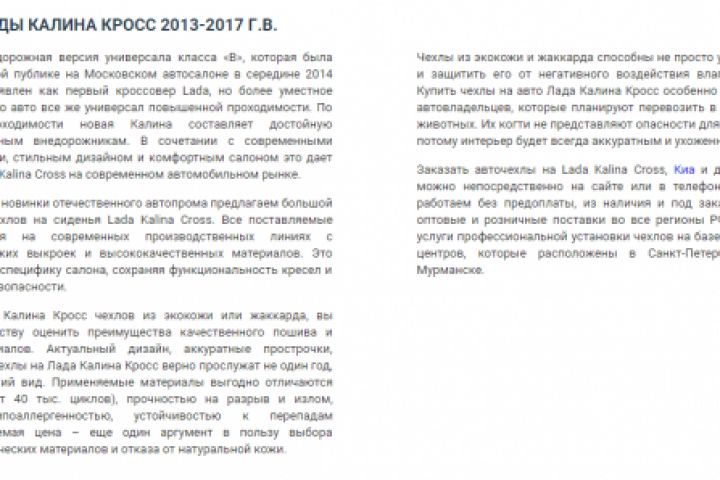 Моя команда занималась наполнением практически всего сайта http://autochehol777.ru Могу отправить еще примеры работ, сделанные для этого заказчика.