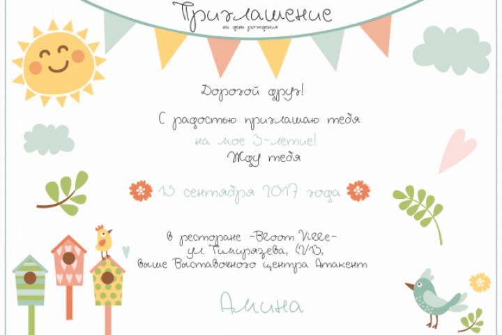 Размер: 12 х 17 см - Печать: для односторонней - Текст: внесение изменений имен, обращений, названия и месторасположения места проведения мероприятия, согласно вашим данным - Формат: JPEG и PDF Стоимость дизайна - 1500 рублей