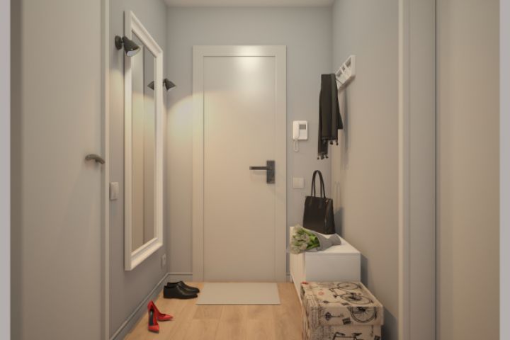 Проект квартиры не предусматривал перепланировки. В типовом варианте прихожая небольшая, вмещает тумбу для обуви, вешалку, пуф и зеркало. Основной гардероб расположен в комнате
