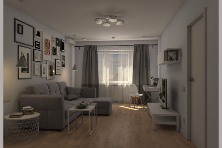 Поскольку в квартире комната всего одна, она поделена на зоны - зона отдыха (раскладной диван-кровать, ТВ напротив), рабочая зона у окна, место для хранения вещей (шкаф-купе во всю стену)