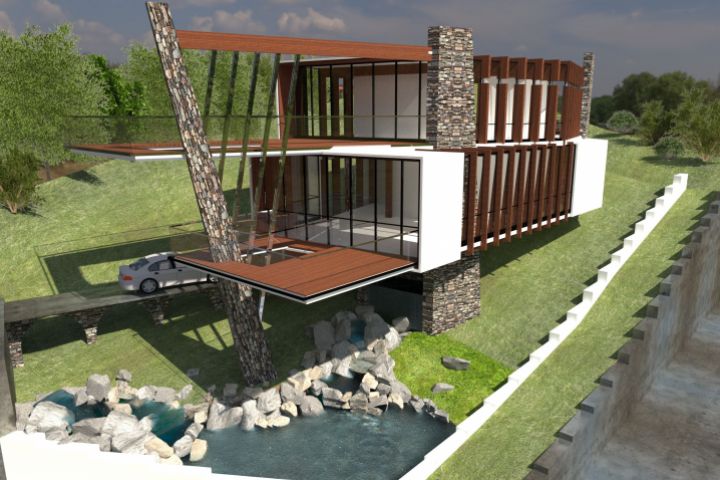 здание расположено на маленьком клочке земли всего 5 соток площадью с террасами 450м2 и естественным бассейном