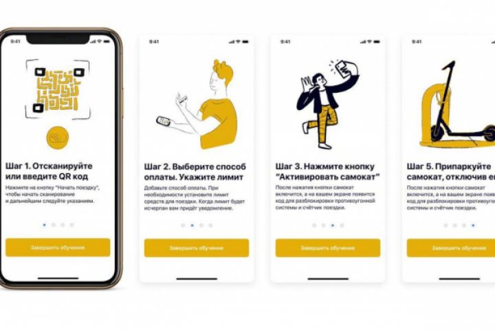 Иллюстрации и экраны обучения для приложения по аренде самокатов