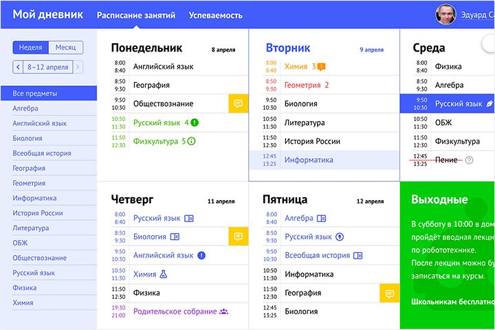 1. Расписание занятий в масштабах недели и месяца с возможностью фильтрации по предметам и с комментариями и оценками преподавателей за конкретный день.