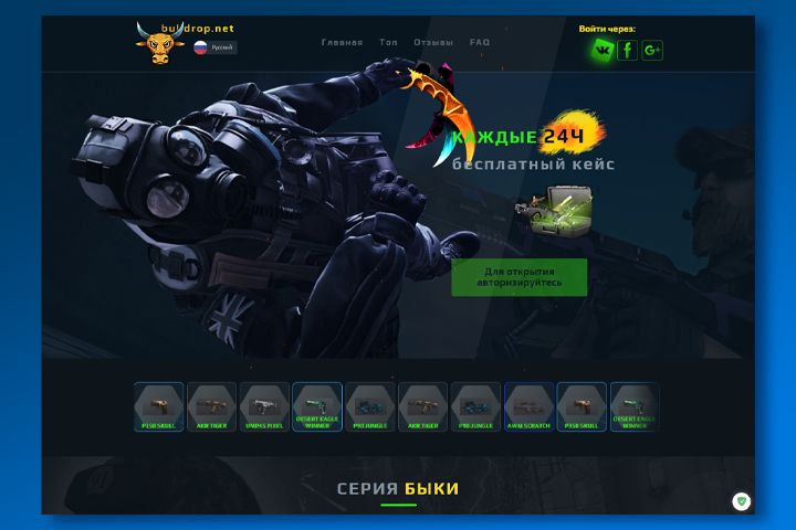 - Далее само содержание сайта – Разные кейсы (каждый кейс открывается на новую страничку и там показано что за предметы в нём) с предметами (с указанной ценой) – всего по 5 кейсов в одной строке на главной странице