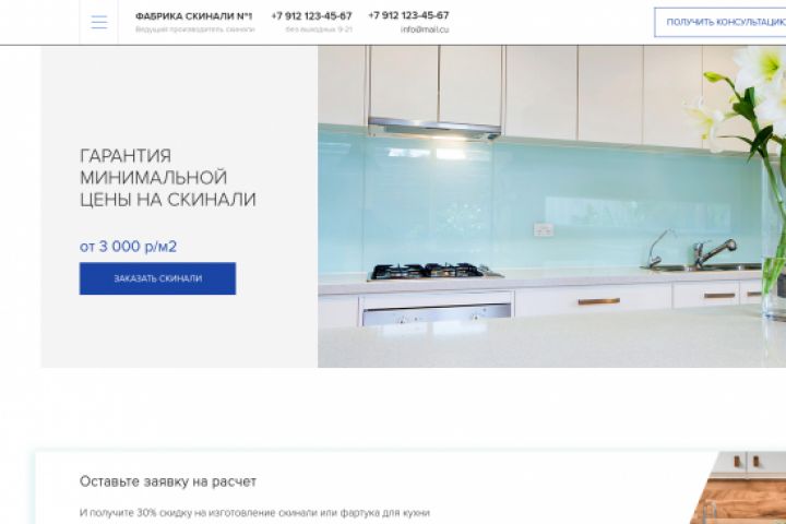 Сайт для производителя скинали, с описанием цен, примерками вариантов в галерее, блоком с картой и контактами, хэдером, в котором есть контактные данные, кнопка обратной связи и бургер-меню. Сайт адаптирован под мобильные версии