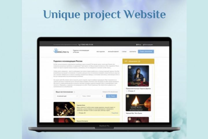 Создавая онлайн-каталог гадалок и ясновидящих, мы также опирались на современные тенденции. Разработанный нами проект привлекает простотой и спокойным исполнением за счет использования сглаженного шрифта Muller и сочетания мягких оттенков голубого и синего.