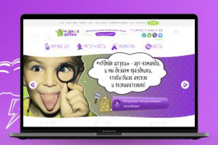 Онлайн-проект создателей «Умных праздников» для детей позволил профессионалам поэкспериментировать формой надписей, придав им уникальности. И даже при всей яркости и разнообразии дизайна сайт все равно выглядит лаконичным!