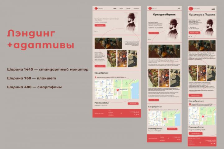 Сайт выставки отражает характер и судьбу художника 19 века (Анри де Тулуз-Лотрек). Выполнено несколько адаптивов, а так же выбран логотип.