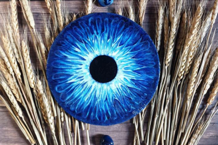 Рельефная картина особых насыщенных оттенков синего. 25 см. Акрил, холст на картоне, серебряный пигмент, лак.