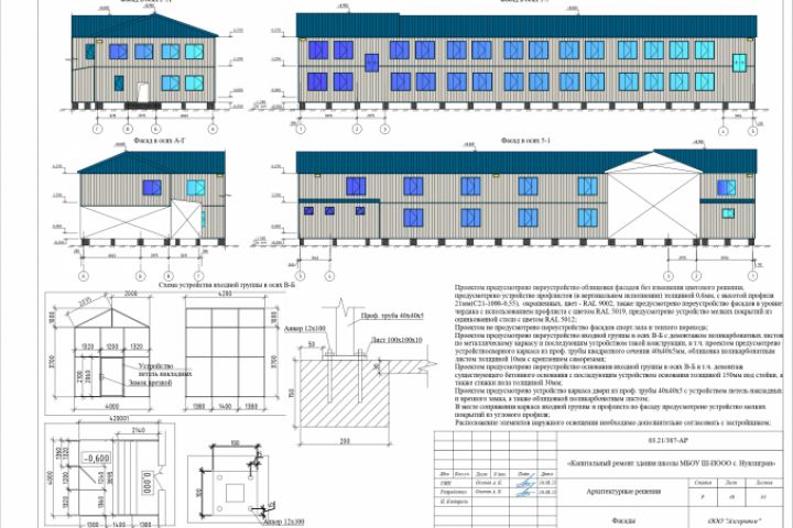 Проектом предусмотрен капитальный ремонт здания школы. Особенностью проекта является то, что здание является деревянным, поэтому проектом предусмотрено устройство противопожарных перегородок и пожаростойких видов отделки полов, стен и потолков, также проектом предусмотрена замена наружней отделки здания, ремонт перекрытий первого этажа и фундаментов, разрушенных в результате воздействия морозного пучения.