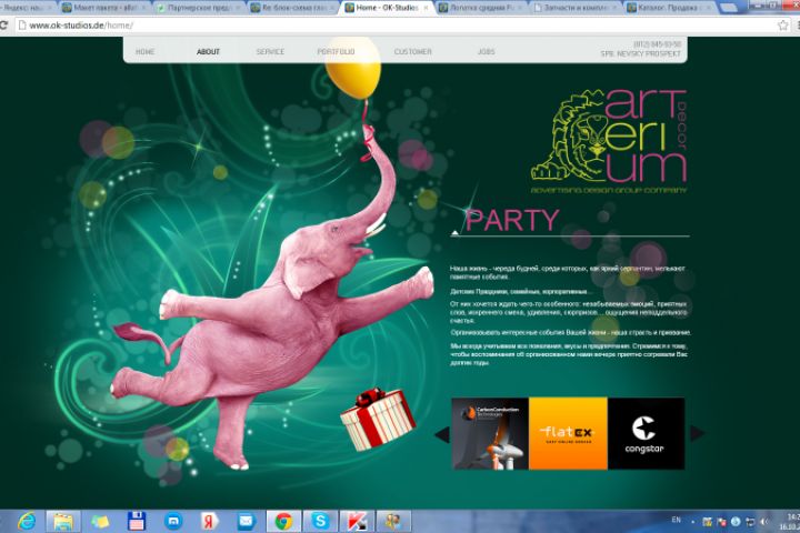Концепт сайта: каждая страница имела свой уникальный дизайн (я буду кидать их понемножку в ленту), цветовую гамму и легенду, но общая объединяющая история -это уникальность образов. На этой странице «организация праздников» вы видите розового слона и фон в стиле цирка du Soleil.