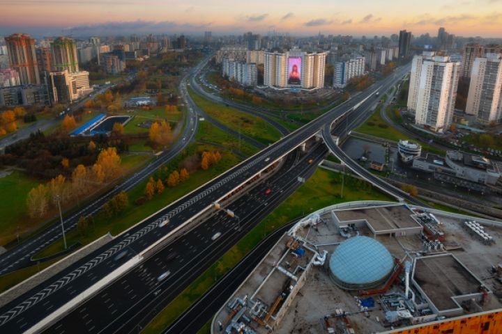 Развязка на Ленинском проспекте и гостиница "Салют". Москва, Россия. Октябрь 2021