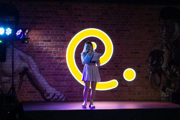 Ведущая оглашает результаты на сцене.