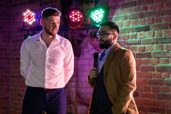 Один из победителей с ведущим на сцене.