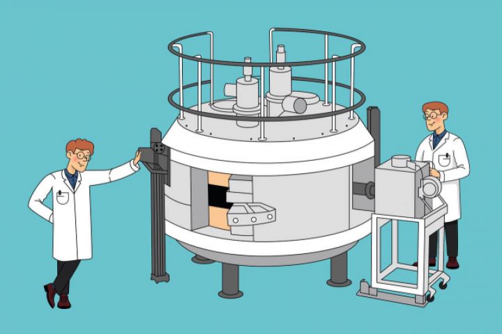 Это принт для корпоративной футболки, изображающий инженеров с циклотронном, для компании IBA, которая создает медицинское оборудование для всего мира.
