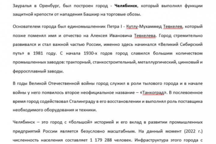 Текст подразумевает раскрытие 10-ти городов с ознакомительной целью. Инфраструктура, численность населения, выдающиеся люди, культурное наследие и др.