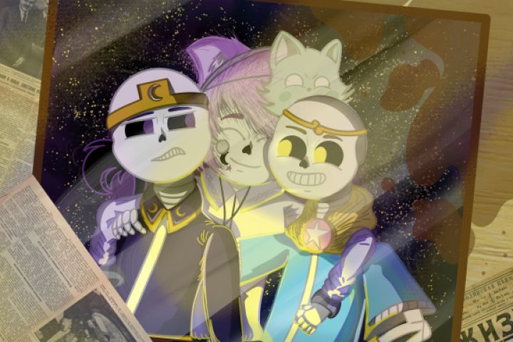 Рисунок для блогера Хазуки Чан с Найтмером и Дримом. Оба являются братьями, хоть и совершенно с разными характерами (солнце и луна). Изображение является картиной, на которую пролили кофе и на которой разложены газеты. Есть множество теорий что здесь случилось от меня, но не выдаст секрета)