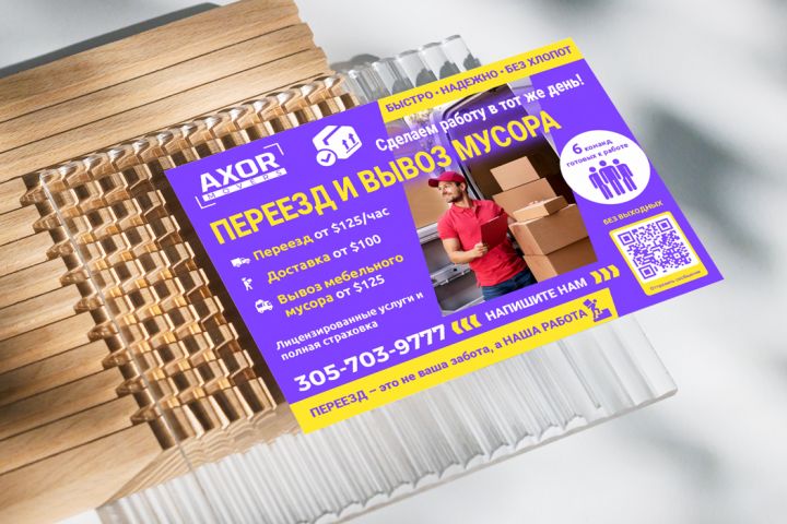Разработка макета флаера мувинговой компании AXOR Movers (USA), русская версия