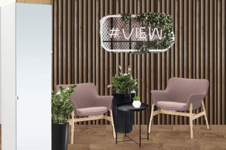 Салон перманентного макияжа - это место где комфорт салона и доверие клиента мастеру стоят в приоритете. Поэтому приятная атмосфера зоны ожидания была создана за счет нежной цветовой гаммы (розовые кресла, стены нежно-розового цвета) и использования пола и перегородки из дерева натурального оттенка для зонирования помещения на процедурный зал и входную группу. Так как салон - это место внешнего преображения клиента, на выходе расположен гардеробный шкаф для верхней одежды и бахил/урны под бахилы с зеркальной дверцей.