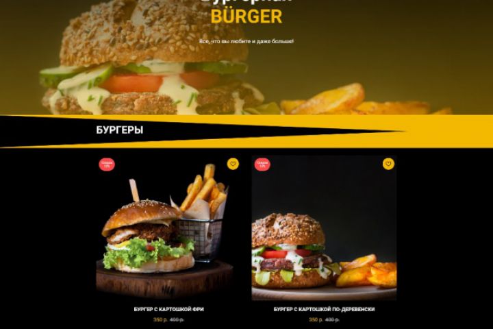 Сайт бургерной с подключенным каталогом и выводом товаров по категориям. Подключены корзина и возможность выбора оплаты/доставки.