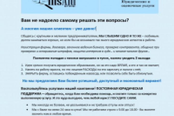Воспользуйтесь услугами нашей компании! ПОСТОЯННАЯ ЮРИДИЧЕСКАЯ ПОДДЕРЖКА – обращаетесь, когда Вам необходима помощь, и платите только за конкретно выполненную услугу. И это куда выгоднее, чем любой юрист! ПОСУДИТЕ САМИ:
