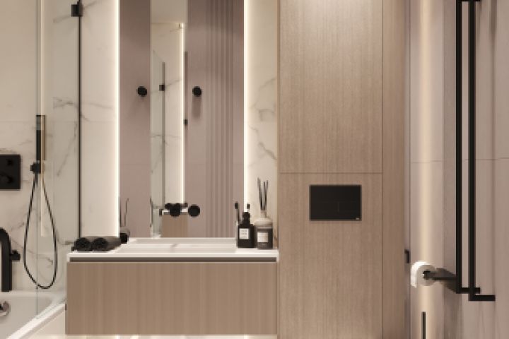 Проект санузла в современном стиле в трехкомнатной квартире в Москве