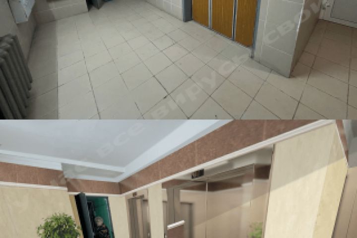 Требовалось удалить грязь, покрасить и преобразить холл, как будто это Германия , а не Россия. Всего было 8 фото, эта одна из них.