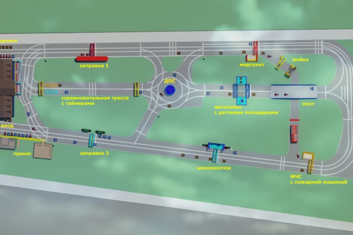 Концепт проект реконструкции и модернизации Городка ГАИ в парке Елочки в Домодедово. В проекте полная проработка генплана и сооружений городка.