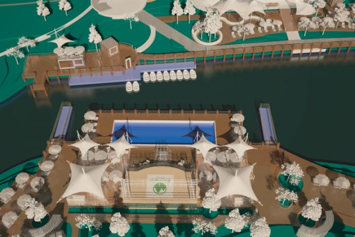 Проект реконструкции зоны вокруг пруда в парке Елочки г.Домодедово. С обустройством лодочной станции и пляжного комплекса с бассейном.