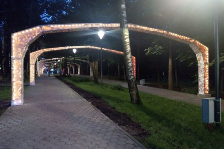 Арки из металлических конструкций по всей Алле Любви в парке Елочки в Домодедово. Арки имеют светодиодную подсветку, управляемую с одного пульта.