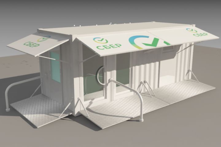 Модернизация морского контейнера под офис СБЕРА. при транспортировке все откидные детали складываются.