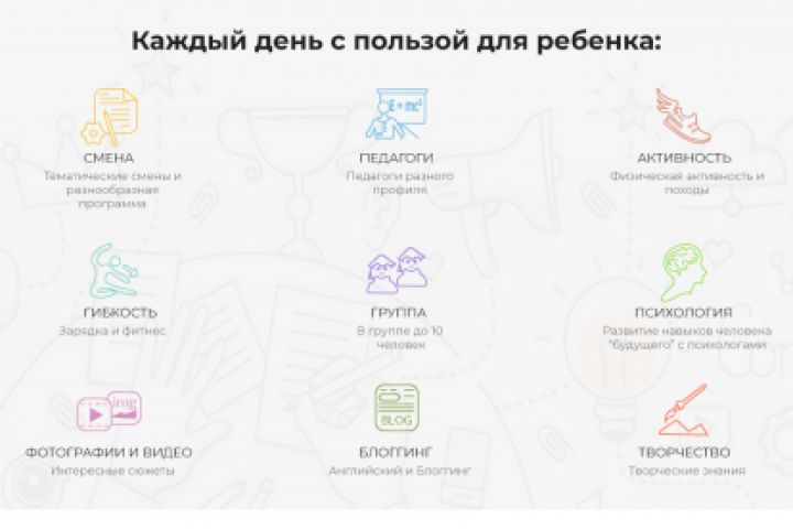 Заказчик пожелал разработку 9 иконок для страницы сайта - https://school-i.by/camp/. Иконки были отрисованы с нуля с подбором цвета.