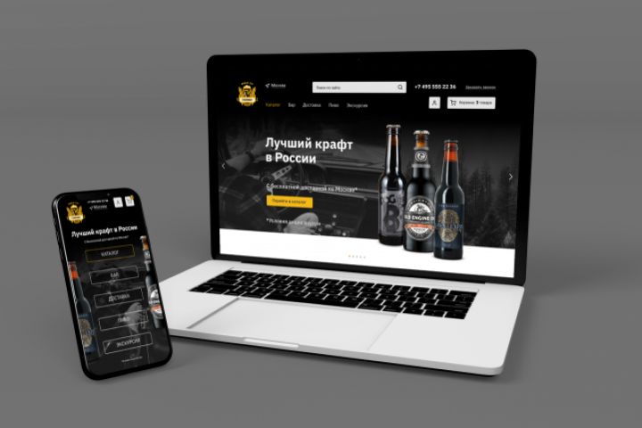 Сайт для пивного бара состоит из нескольких разделов: главный экран, "каталог", "недавно смотрели", "о пиве", "корзина и оплата"