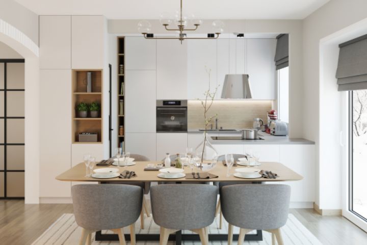 Кухня, объединённая с гостиной и столовой, находится на первом этаже частного дома. Включает в себя зону приготовления пищи с островом, а так же зону принятия пищи в кругу семьи.