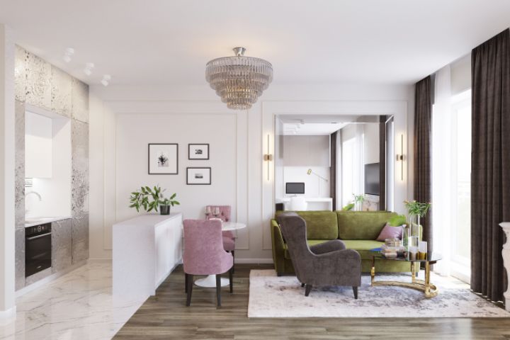 Кухня-гостиная в квартире с панорамными окнами