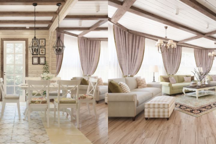 Дизайн кухни-гостиной в доме из клееного бруса