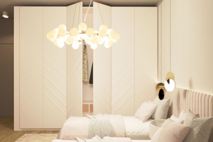 При проектировании были учтены все пожелания маленьких хозяек будущей спальни: девочки хотели отдельно стоящие кровати, рабочее место для каждой, мягкий ковер для совместных игр и много пространства для хранения одежды (для каждой своя зона, чтобы вещи не лежали вперемешку). Система для хранения игрушек перенесена на утепленный балкон, чтобы не занимать место в спальне.