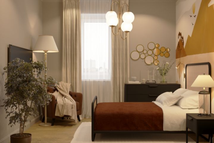 Композиционным центром комнаты стала кровать с элементами из ротанга. Напротив кровати расположилась ТВ-зона с небольшим креслом и изящным торшером для проведения уютных вечеров за чтением любимых книг. Хозяйка не хотела загромождать пространство спальни высоким шкафом и пожелала вместо него предусмотреть комод для вещей.