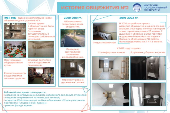 Баннер рассказывает историю общежития за последние несколько лет. Вся информация разбита на блоки, что позволяет легко ее считывать.Чистые и светлые цвета направлены на целевую аудиторию - студентов.