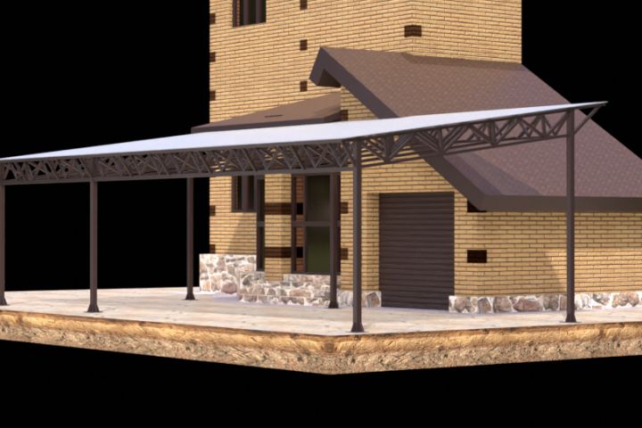 Перед постройкой навеса заказчик заказал у строителей визуализацию чтобы посмотреть как будет выглядеть. Что мы с удовольствием и сделали по предоставленным чертежам и фотографиям дома.