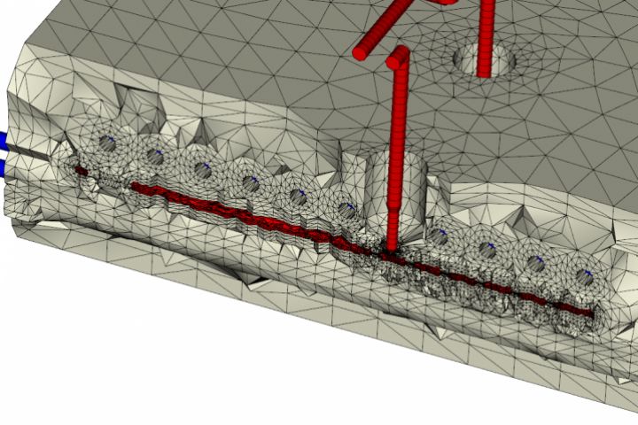 На скриншоте представлен фрагмент конечноэлементной сетки из полного анализа литьевых процессов в горячеканальной пресс-форме для литья изделия "Терка для ног".