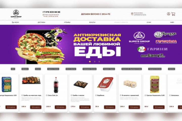 Заказ и доставка еды компании SuperGroup. В ассортименте представлена продукция нескольких ресторанов, входящих в группу.