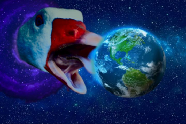 Тут я с помощью разных картинок из инета сделал иллюстрацию того, как огромный гусь-пожиратель из другого мира собирается погладить землю.
