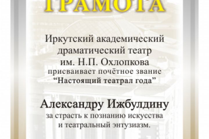 Грамота для участников мероприятия Иркутского драматического театра им. Охлопкова. 2013 г.